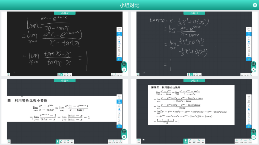 学生小组对比:教师可调用多个学生小组的屏幕同时显示与大屏,作对比教学讲解。