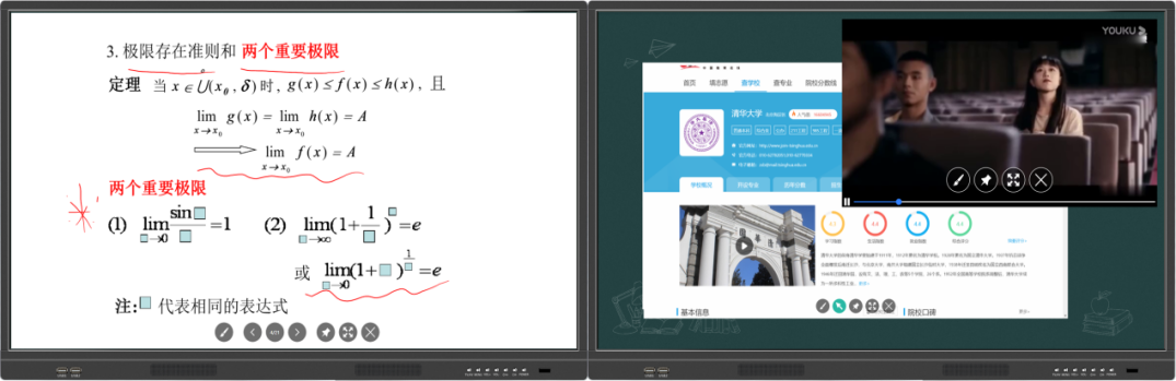 采用全媒体授课板,支持双板教学模式, 两个屏幕既可以融合为一个整体使用,又可以独自显示不同的教学内容,还可以彼此相互关联,同时保留了传统多媒体教学、交互式教学的特征。