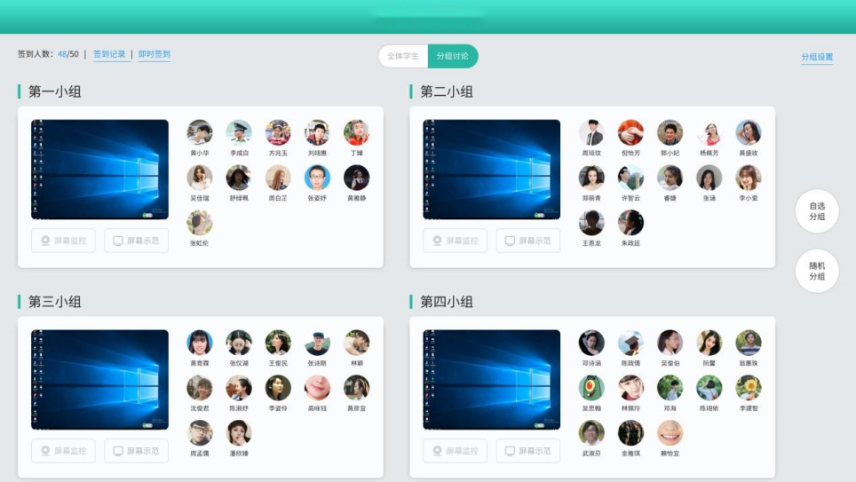分组研讨教师发起分组教学前,可根据每个学生的特点对所有学生进行分组,学生还可以根据座位安排或一定的规则自主选择分组组别 。